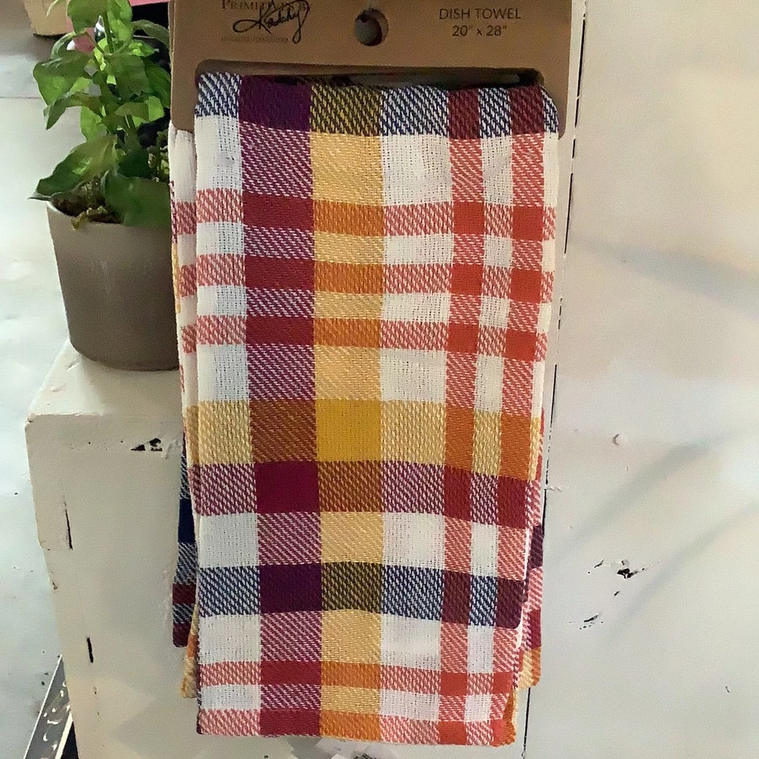 A cotton kitchen towel featuring a multi-colored woven plaid design. Machine-washable, 100% cotton measuring 20″ x 28″