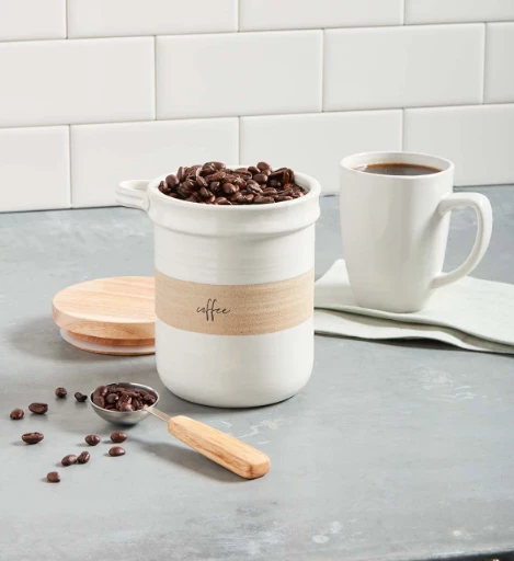 Keep your coffee fresh in this stoneware coffee canister set. The two piece set comes with a glazed and exposed stoneware coffee canister. The coffee canister features the word “coffee” on the front. The canister features a removable lid and side handle. Coffee canister arrives tied with wood and stainless coffee scoop.