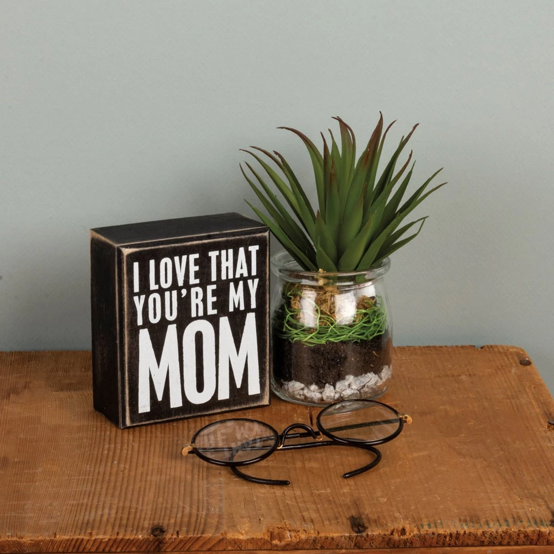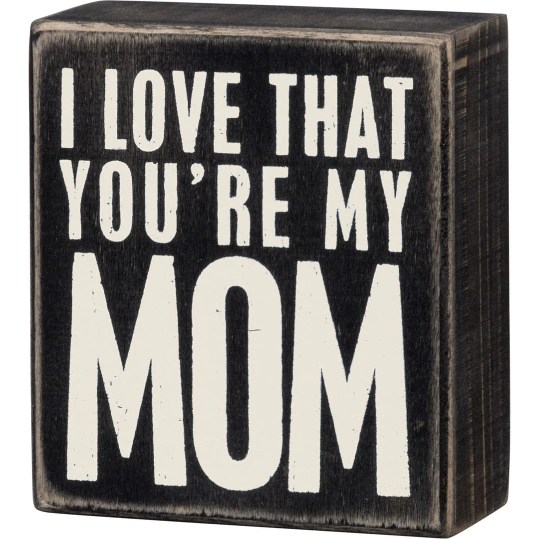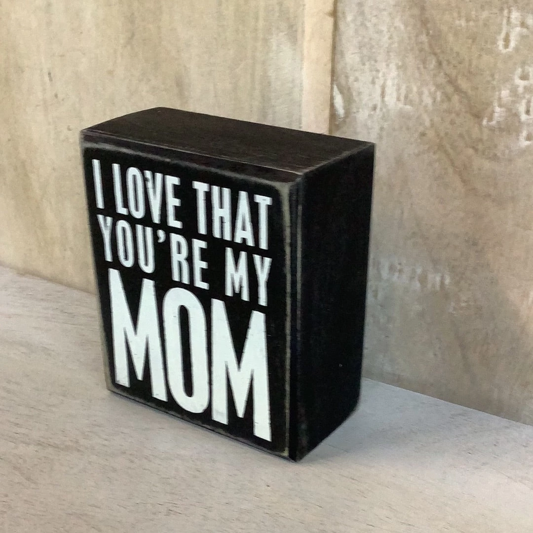 A classic black and white wooden box sign featuring a distressed “I Love That You’re My Mom” sentiment. Easy to hang or can free-stand alone.