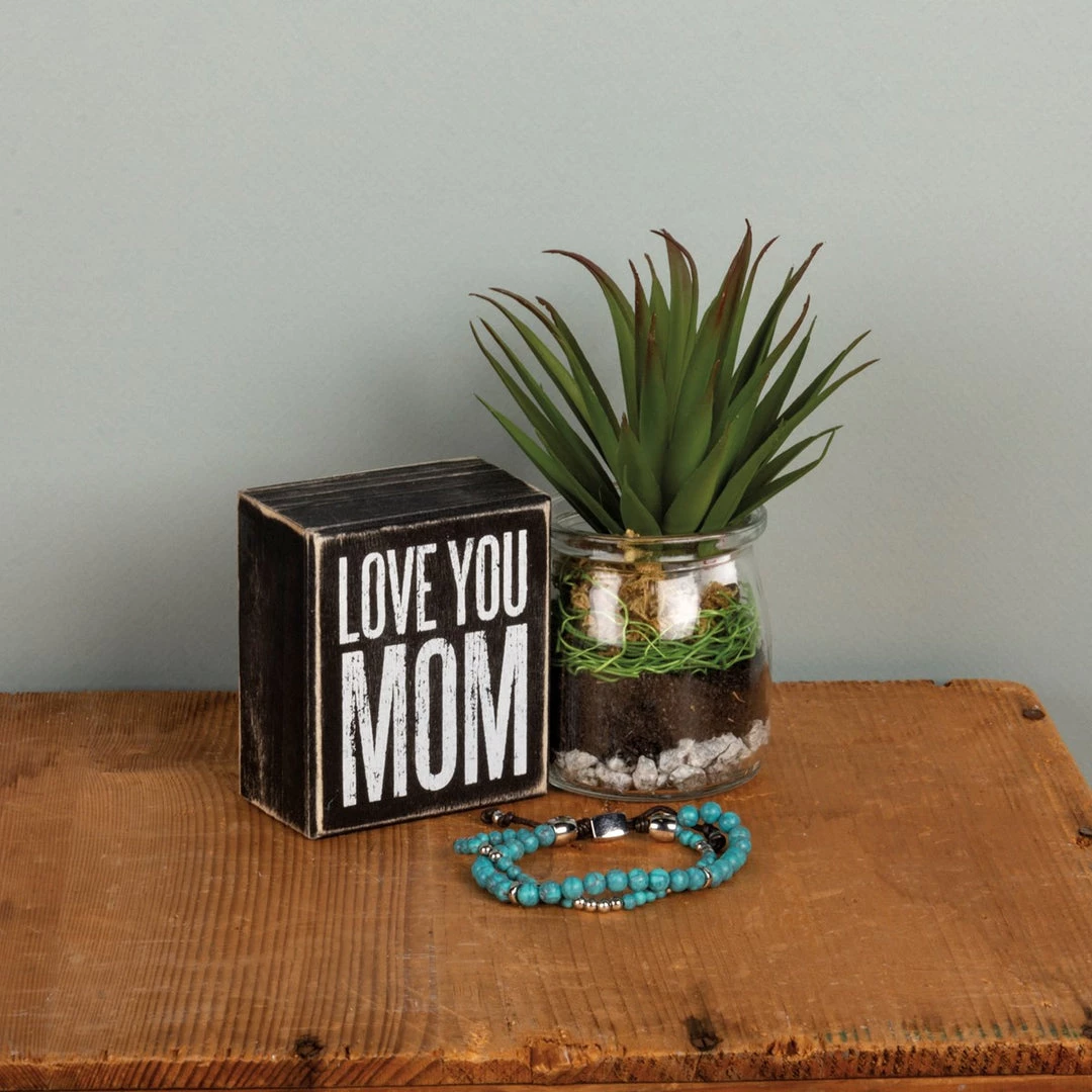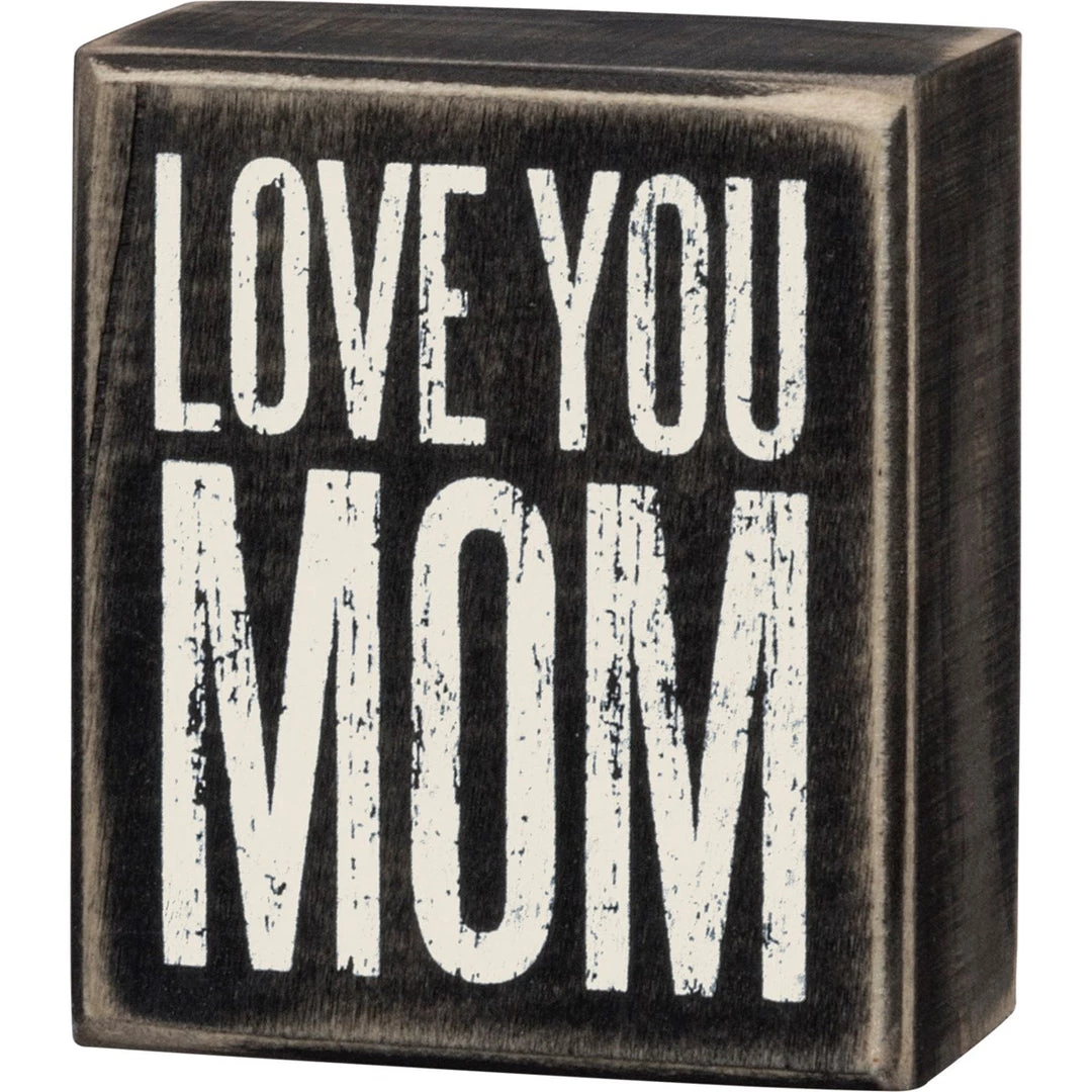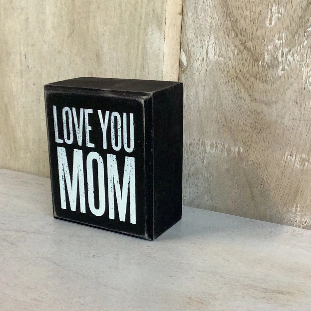 A classic black and white wooden box sign featuring a distressed “Love You Mom” sentiment.Â