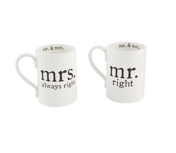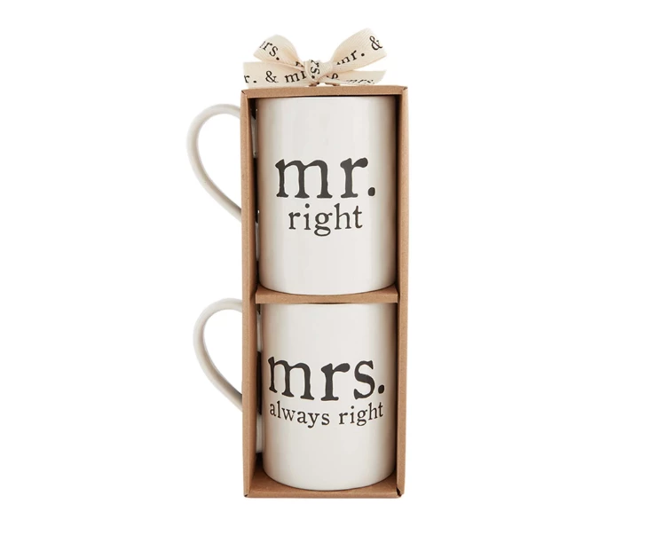 Our Mr. & Mrs. Coffee Mug set is a great gift for the engaged couple or newlyweds in your life. The set comes with two debossed sentiment ceramic mugs. One mug reads “mr. right” while the other mug reads “mrs. always right”. Each mug is 18 oz. and comes in a gift box set.