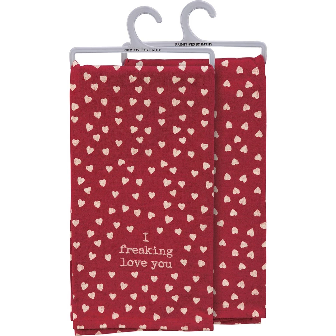A cotton linen blend kitchen towel featuring an all-over heart design with embroidered “I Freaking Love You” sentiment. Machine-washable.