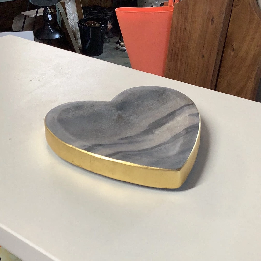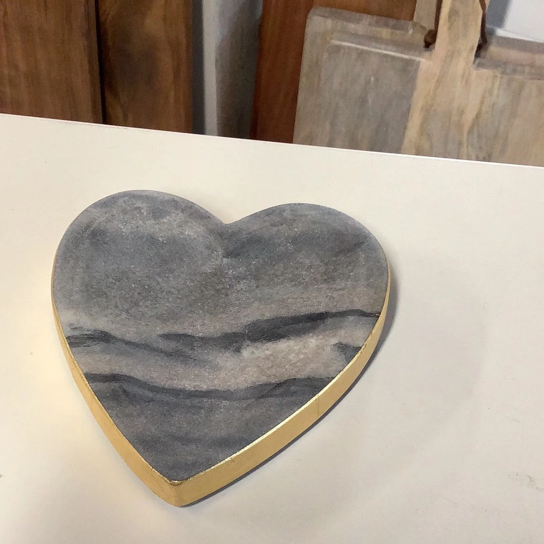 Heart shaped marble trinket tray with gold foil detail around the edges