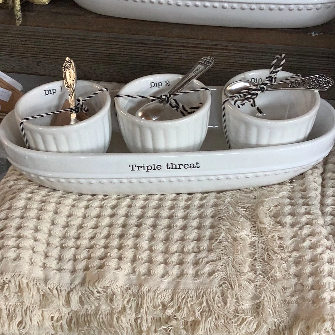 Triple threat cracker bowl features debossed sentiment exterior with raised beaded detail. Arrives tied with three fluted ceramic dip bowls with three vintage-style stamped silverplate spoons.