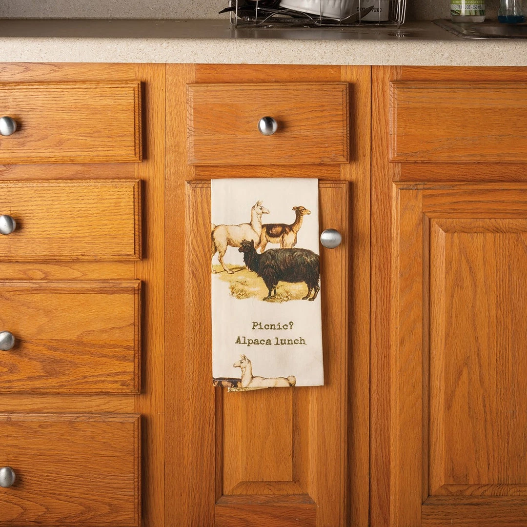 A cotton linen blend kitchen towel is featuring all-over vintage-inspired alpaca designs and punny embroidered “Picnic? Alpaca lunch” sentiment. Features a cotton tape loop in the corner for easy hanging. Machine-washable. Our Picnic? Alpaca lunch kitchen towel is packaged on a cardboard hanger with a hole to easily hang on rack.