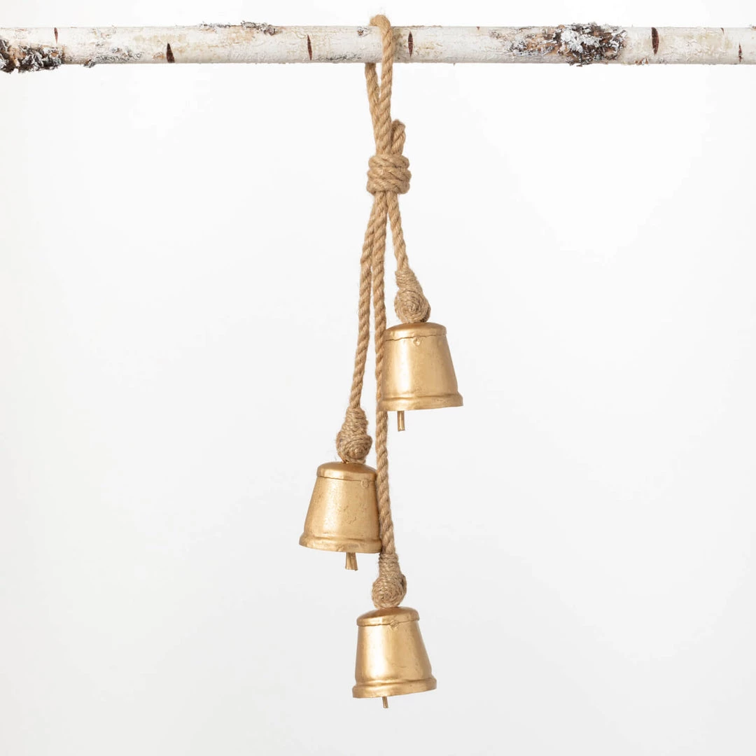 The simple chimes heard around the holidays add a sense of absolute joy and jubilation. This antique gold iron bells suspended from this jute cord swag offers up a memorable sight and sound.