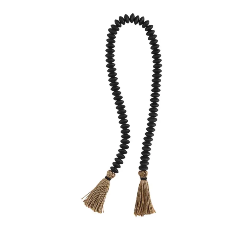 These Black Tassel Decor Beads are the perfect sophisticated finishing touch. The saucer style beads are made of mango wood. The beads are black and features jute twine and jute tassel ends. Style tip: add to your tabletop decor on top of trays or a coordinating book stack!