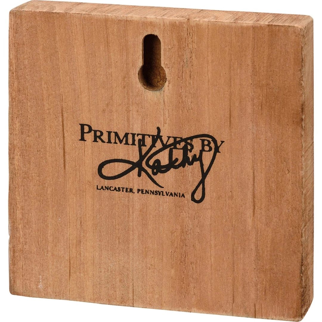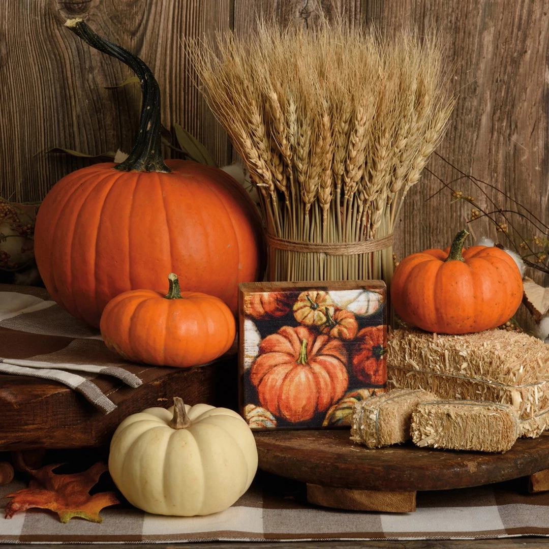 A wooden block sign depicting a close-up of a bunch of pumpkins. Design is replicated from original artwork painted onto burlap canvas, giving the art a unique depth and texture. Easy to hang via predrilled keyhole slot or can free-stand alone!