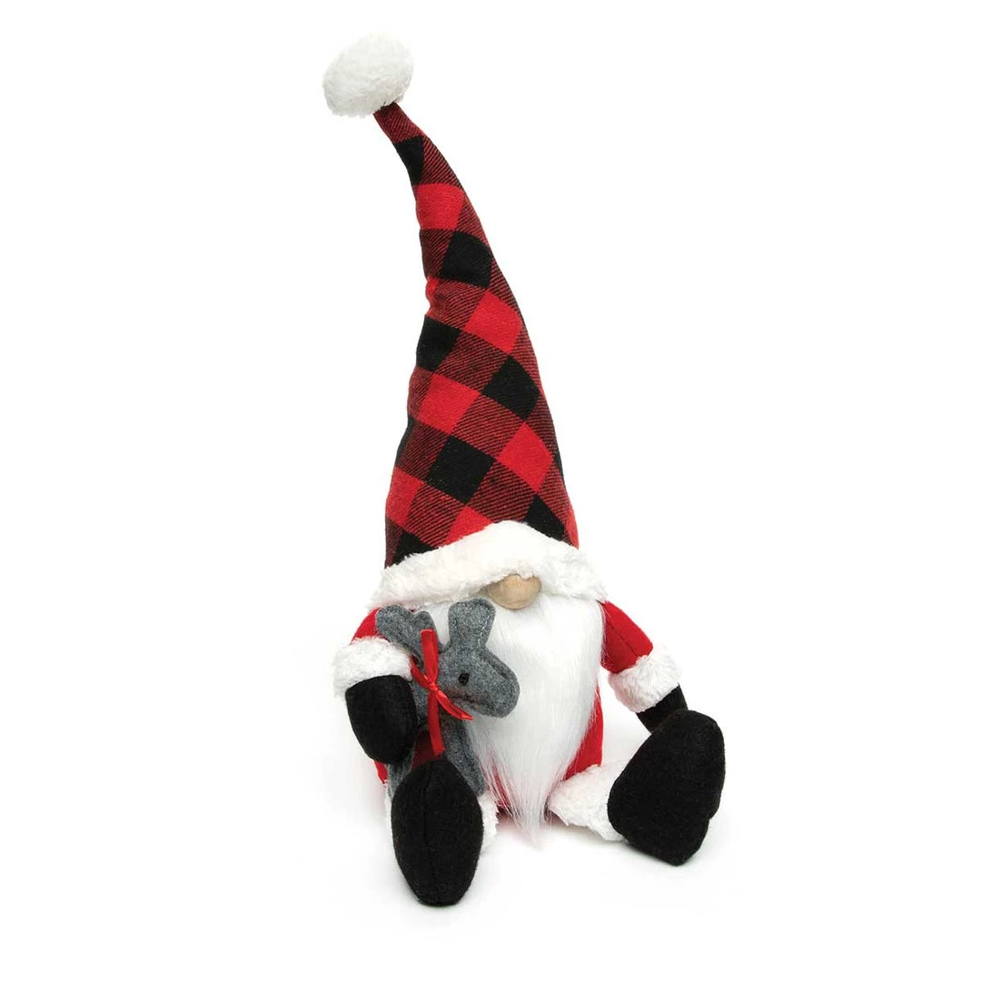 BUFFALO PLAID GNOME WITH WIRED RED/BLACK PLAID POM-POM HAT, WOOD NOSE, WHITE BEARD, RED/WHITE SUIT, LEGS AND ARMS HOLDING DEER LARGE