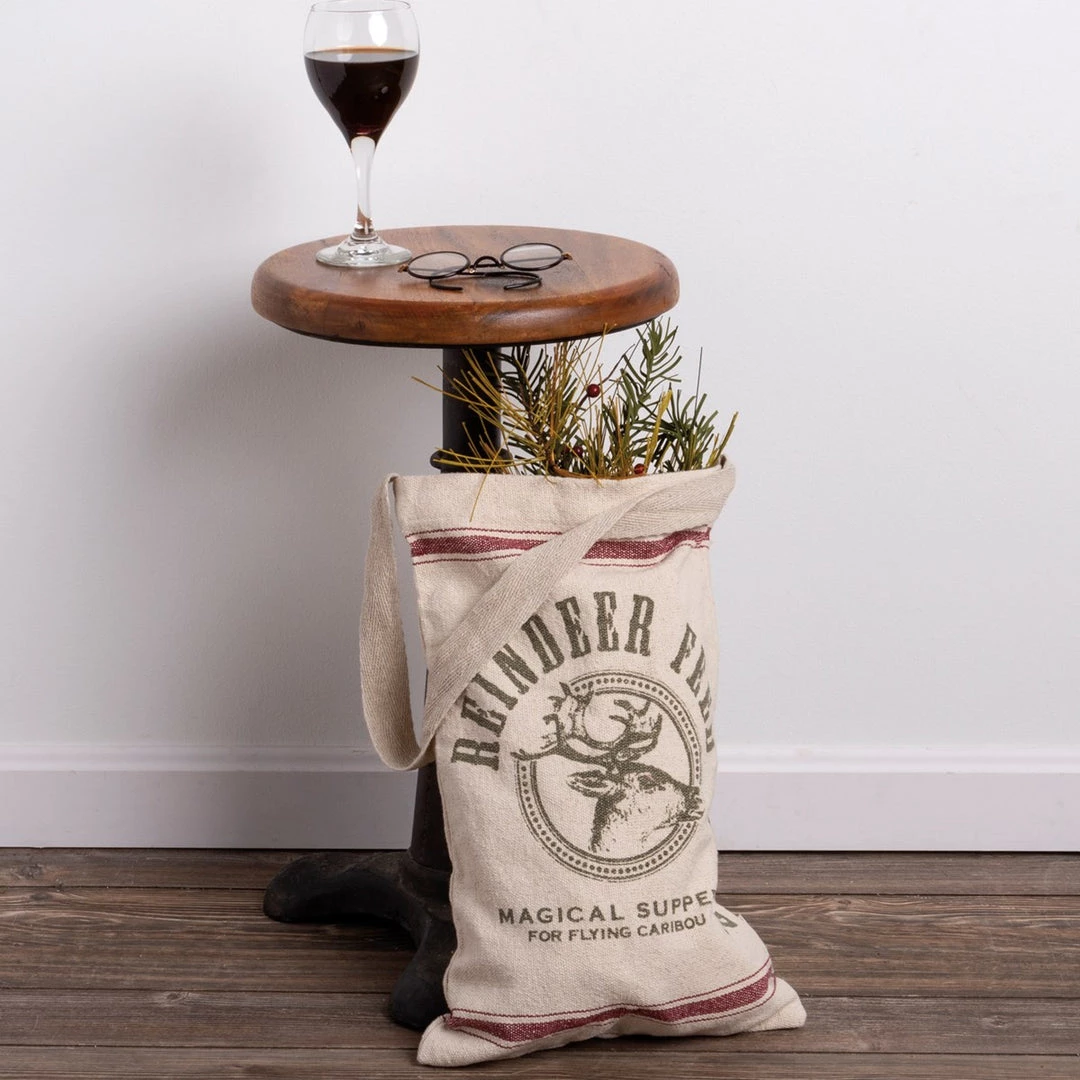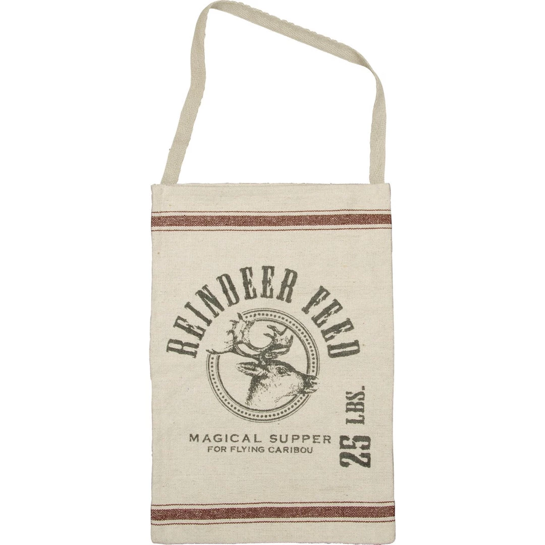 A cotton and polyester hanging bag featuring a distressed “Reindeer Feed – Magical Supper For Flying Caribou – 25 Lbs.” sentiment with striped trim accents, reindeer label design, and top strap for easy hanging.