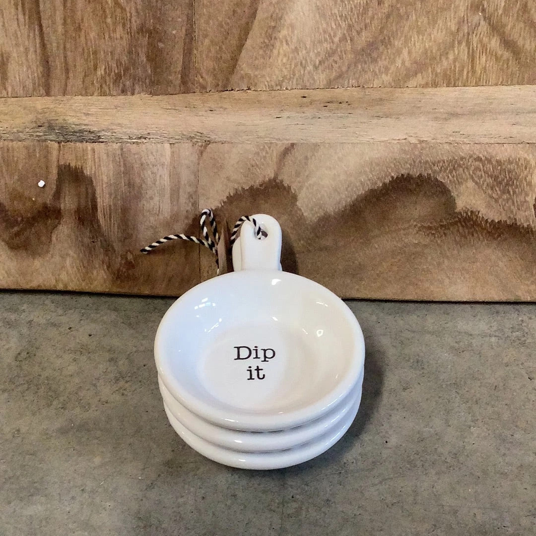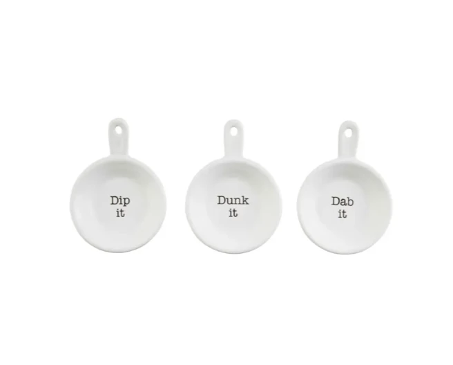 Dab, dunk or dip with our Dipping Dish Set. The nested set comes with three fluted ceramic dipping dishes. The dishes feature adorable fluted side handles. The set arrives tied together. The dishes feature the following sentiments “Dip it”, “Dunk it” and “Dab it”. Stack dishes on top of one-another for easy storage.