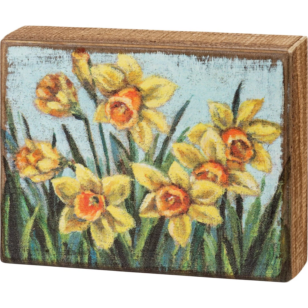 A wooden box sign featuring daffodils. Design is replicated from original artwork painted directly onto burlap canvas, giving a unique depth and texture to the art. Easy to hang or can free-stand alone.