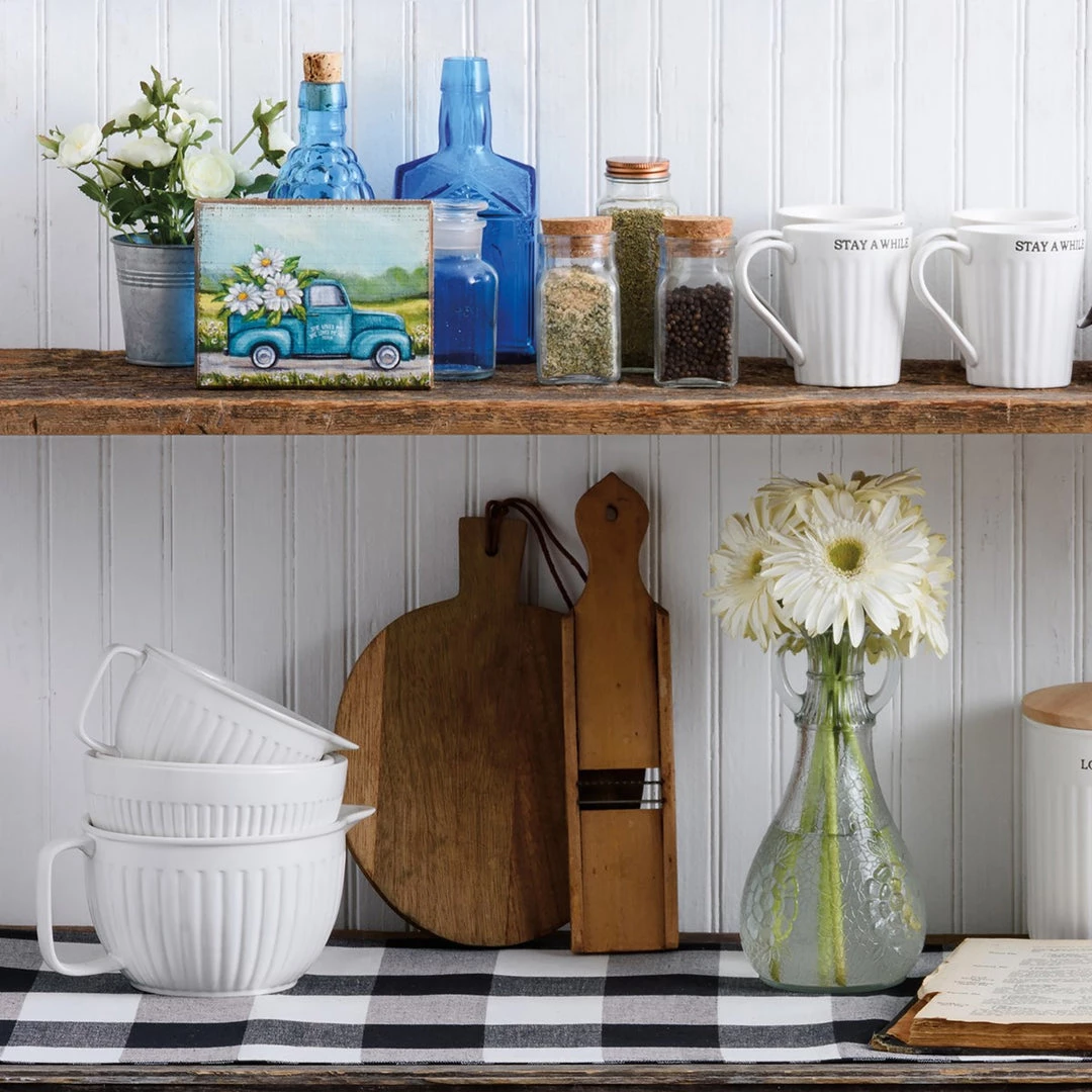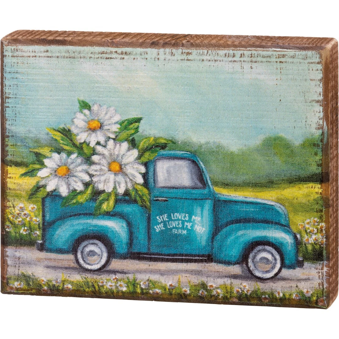 A wooden block sign featuring a whimsical design of a truck hauling oversized daisies. Design is replicated from original artwork painted onto burlap canvas, giving the art a unique depth and texture. Easy to hang via predrilled keyhole slot or can free-stand alone!