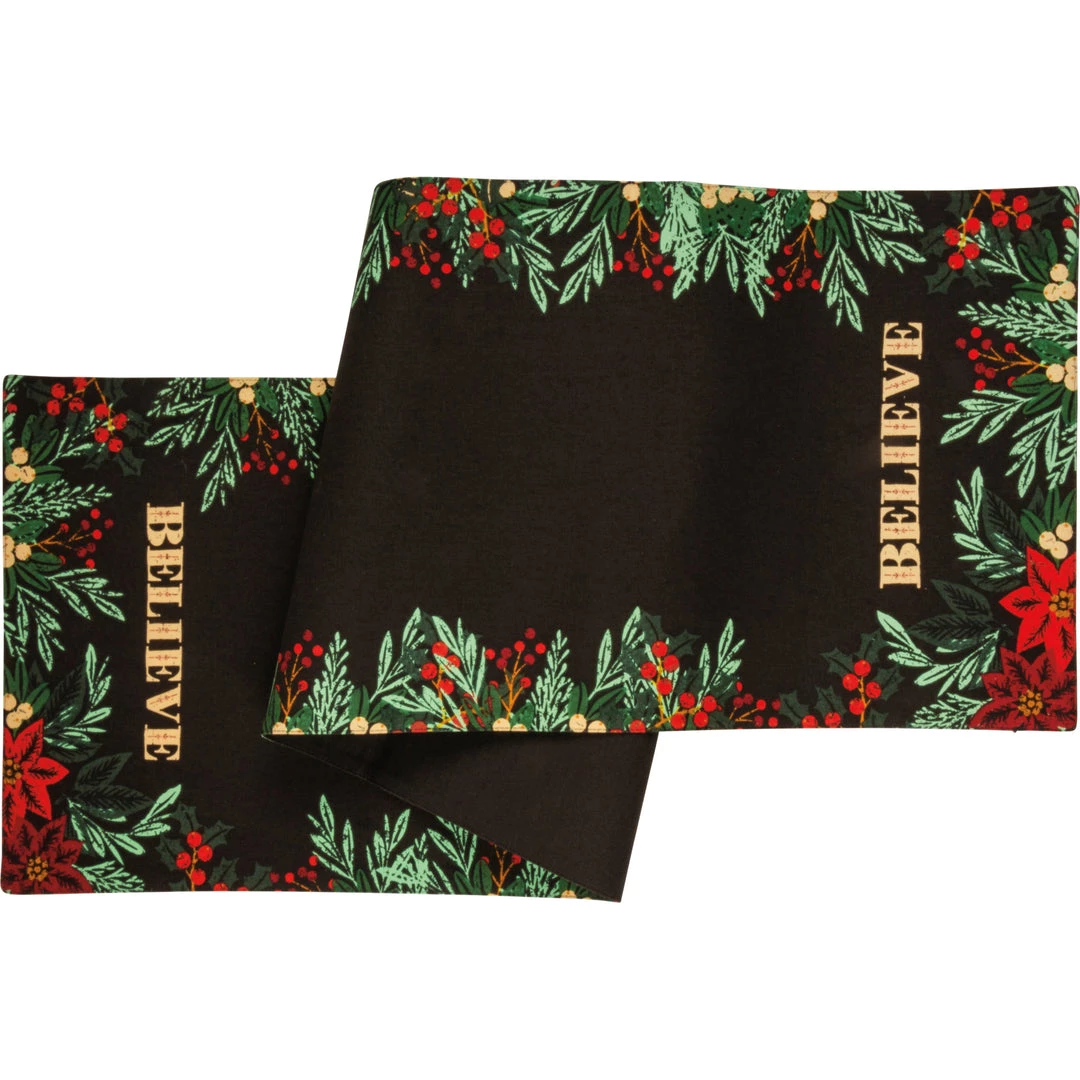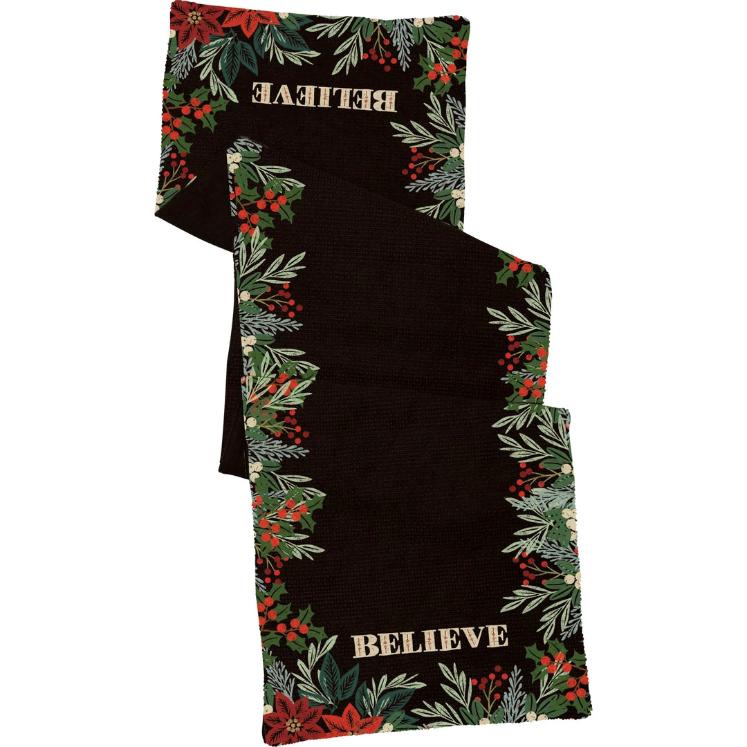 A cotton table runner for Christmas. Features a “Believe” sentiment on each end and moody holiday designs for an elegant feel. Machine-washable.