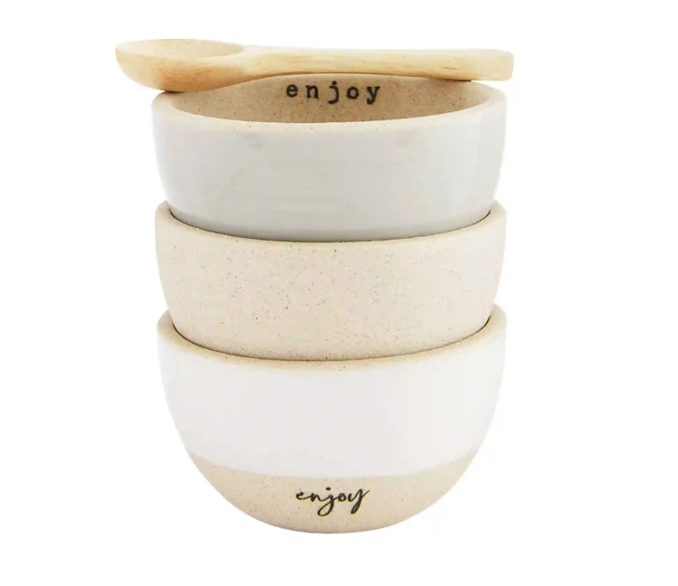 Get ready to dip and enjoy with our Enjoy Stoneware Ramekin Set. The four piece set comes with three stoneware dip ramekins. The ramekins feature a unique coloring and the sentiments “enjoy”. The dip bowl set also comes with a wood spoon. Perfect for dips and bar snacks!