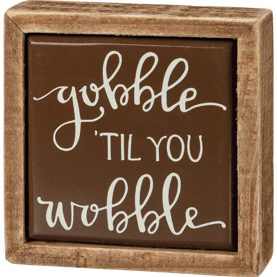 A wooden box sign mini featuring a hand lettered “Gobble ‘Til You Wobble” sentiment and tile-like finish. Easy to hang or can free-stand alone.