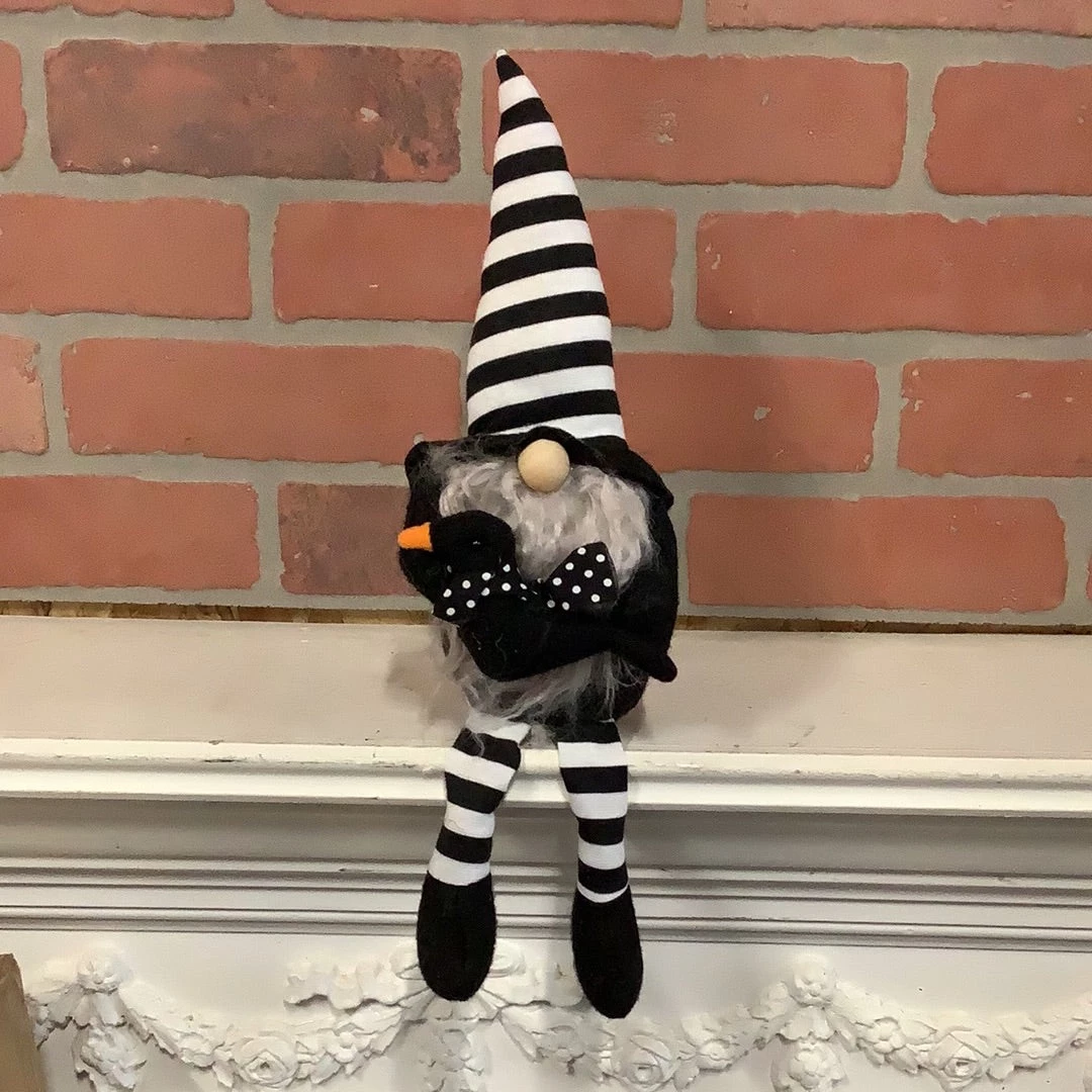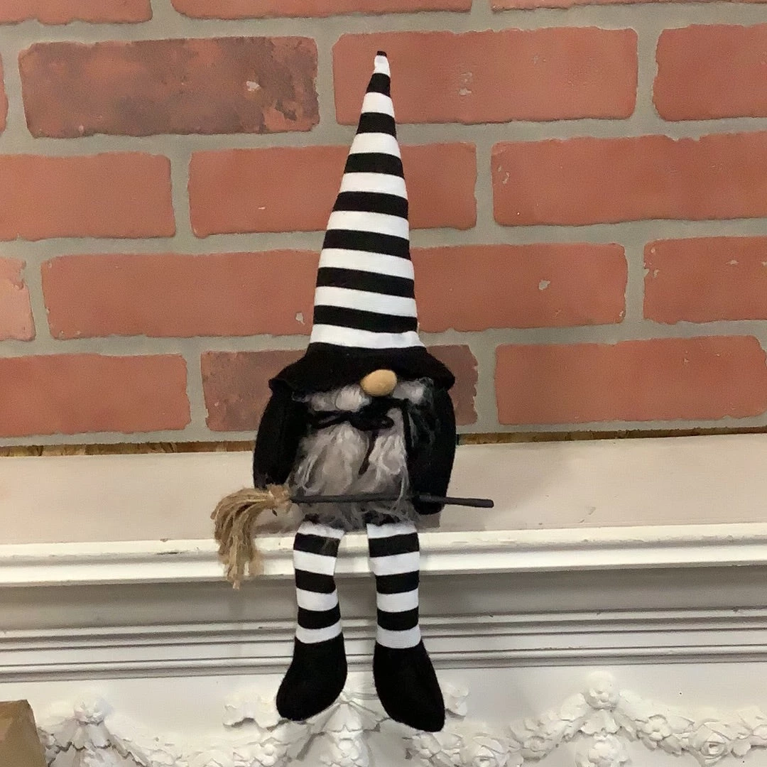 Witch craft gnome couple with black an white stripes, woo noses, floppy legs. One has grey pig tail and a broom, the other has a grey beard and a crow.