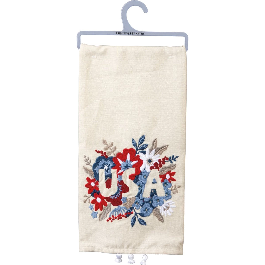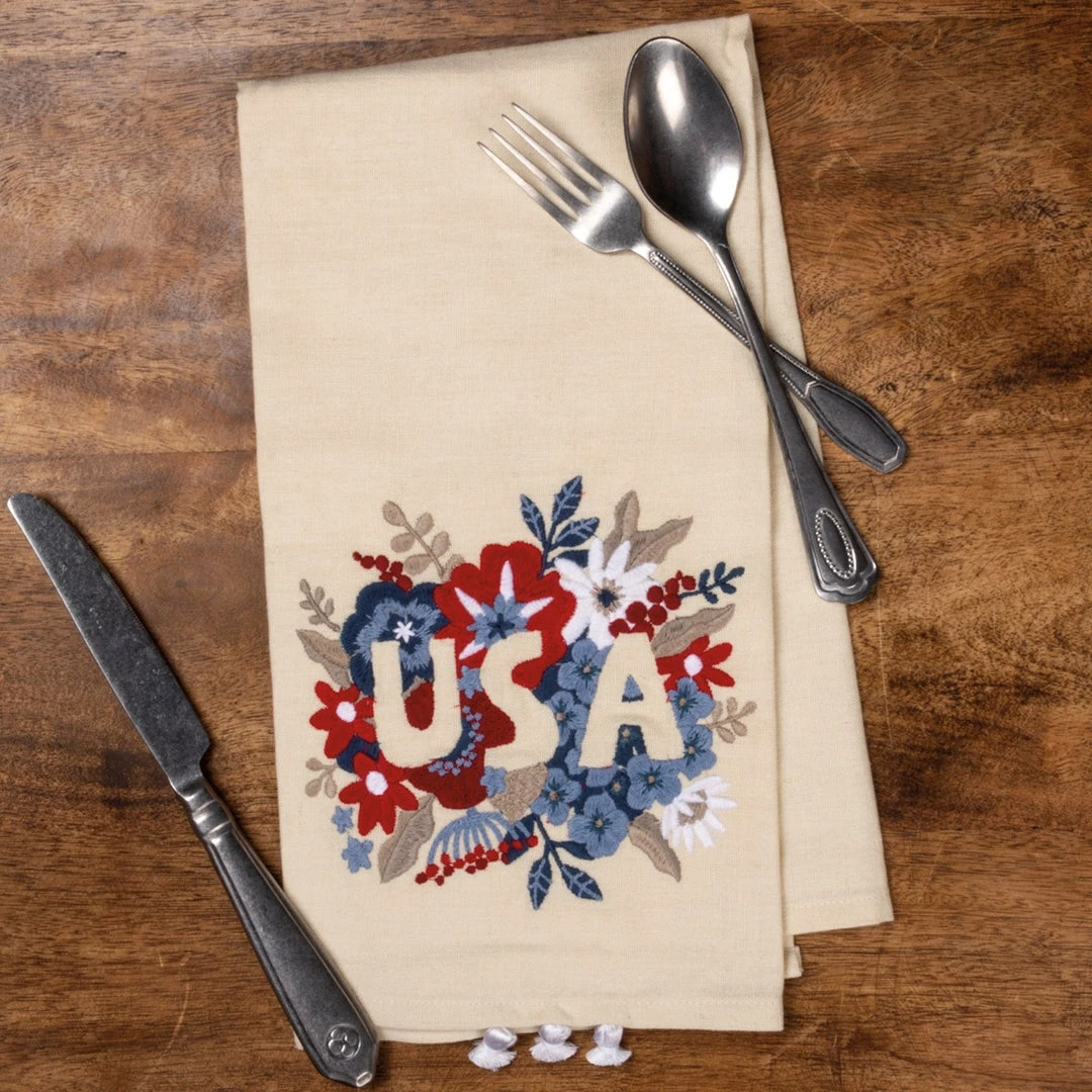 A cotton and linen kitchen towel featuring an embroidered “USA” sentiment, floral designs, and tassel trim details. Machine-washable.