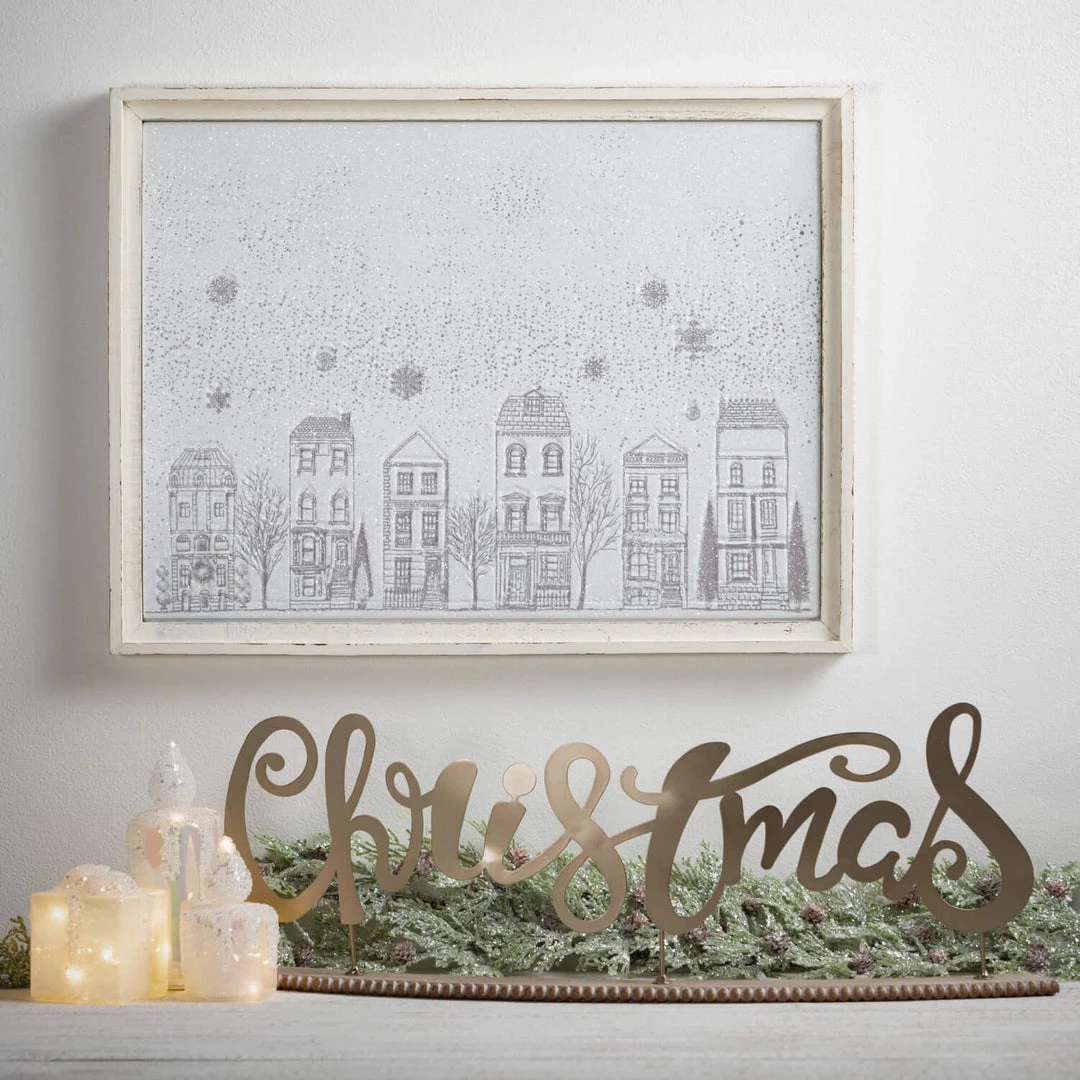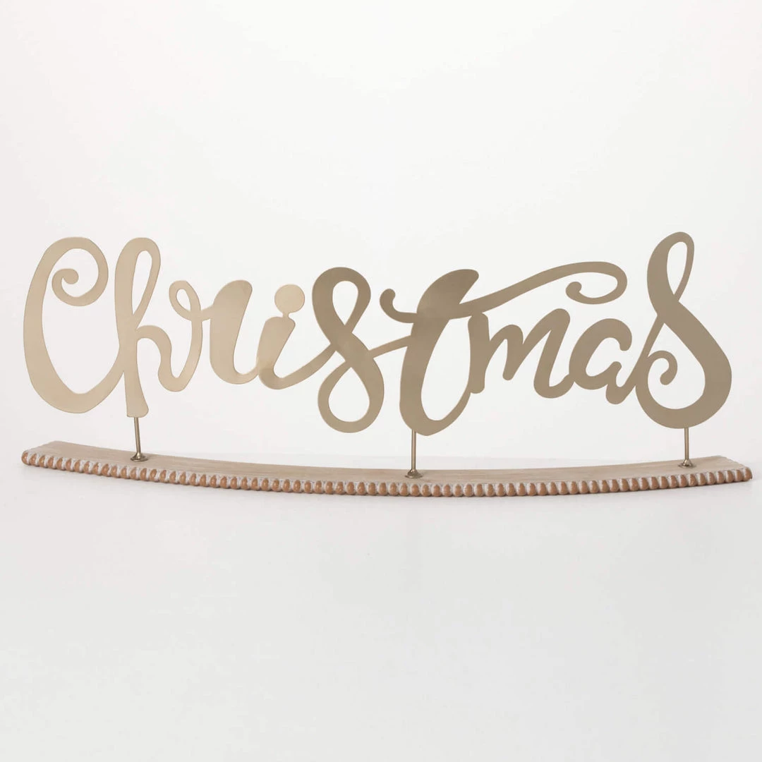 Adorn your surface with this stylish seasonal metallic signage. Intricately laser-cut lettering spells out “Christmas” & is supported by a simple base with beaded trim. This exclusive piece measures