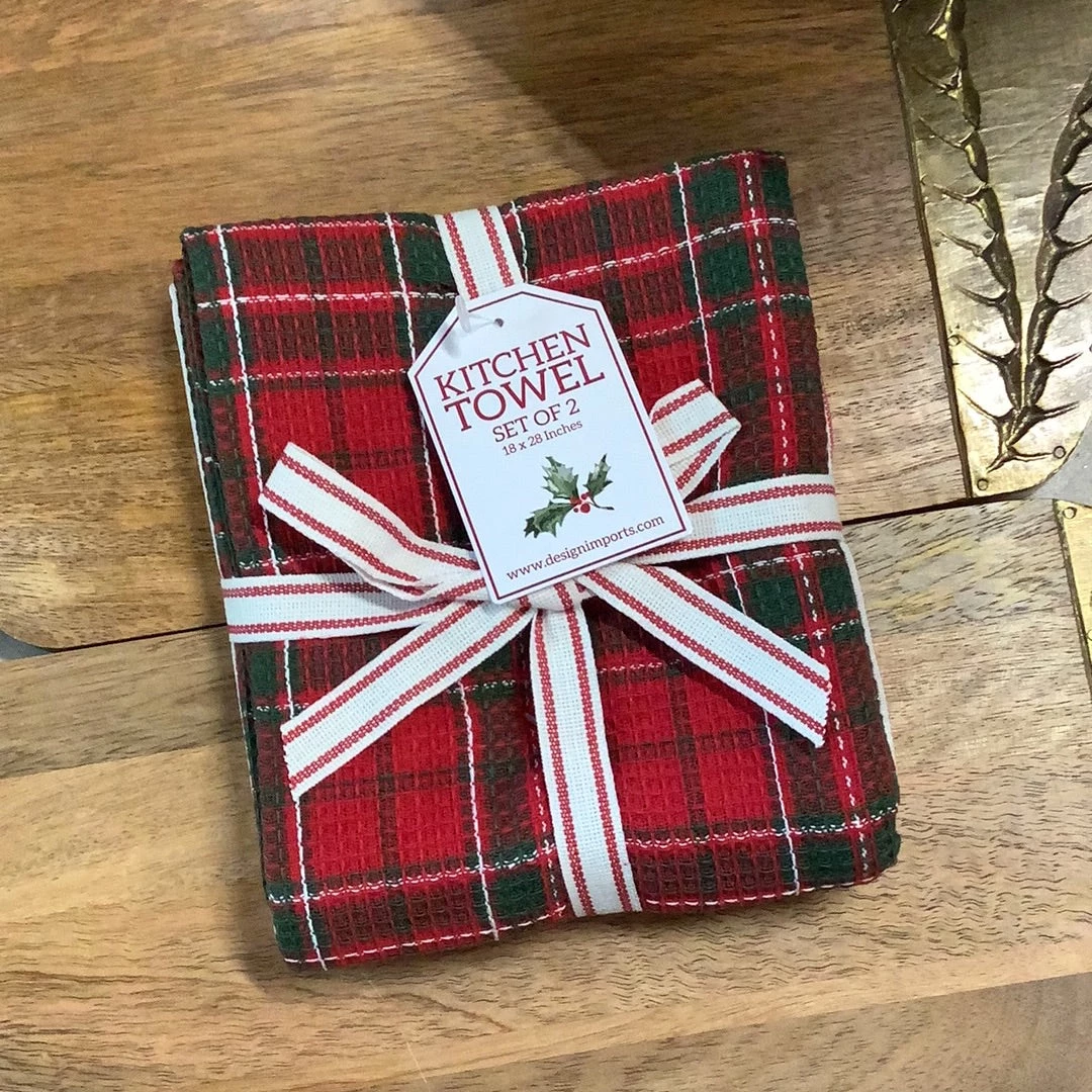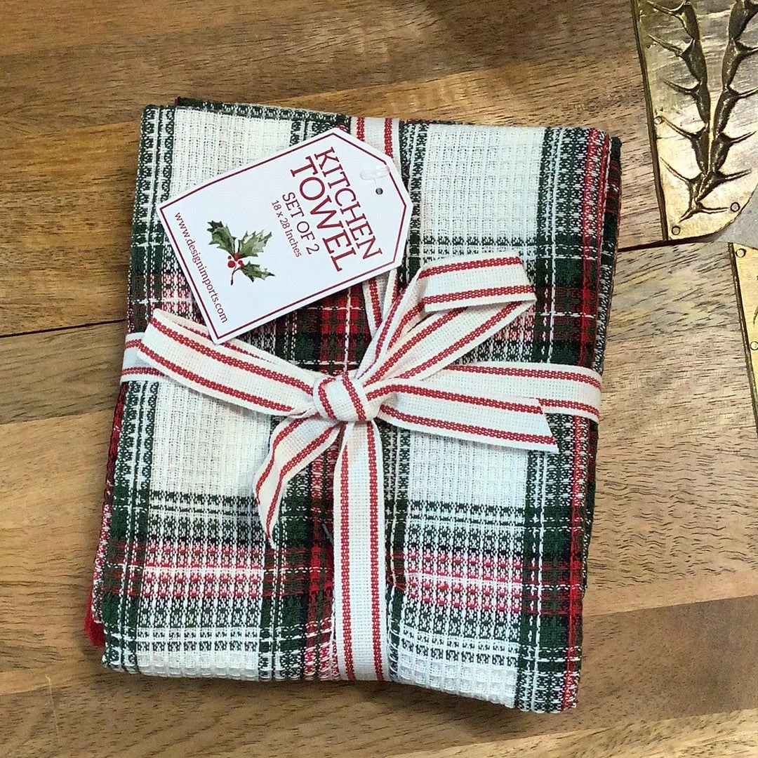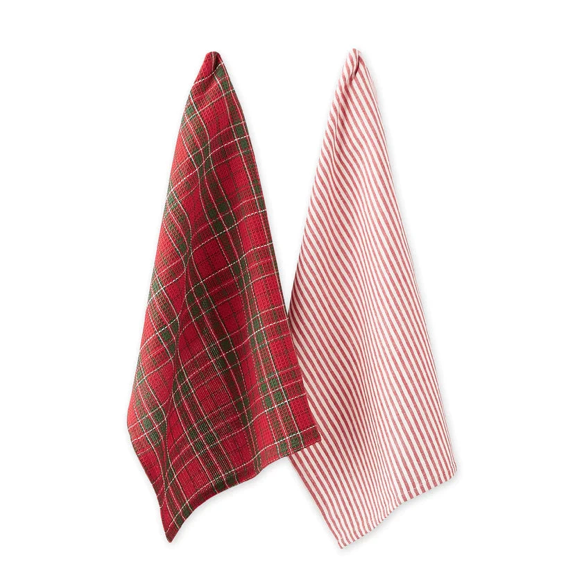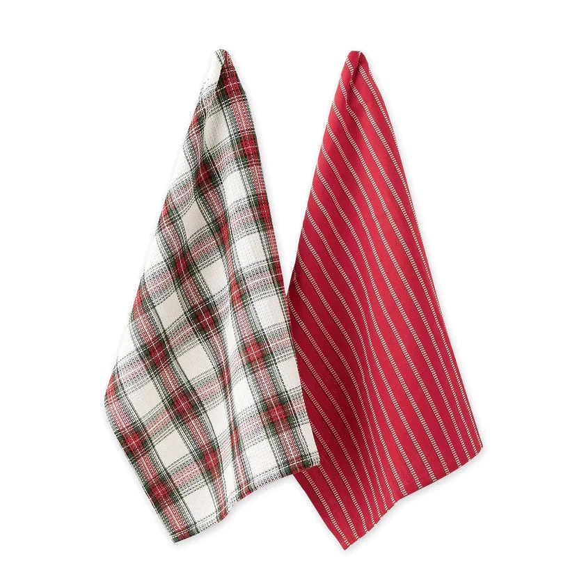 Set includes 1 waffle plaid dishtowel and 1 striped dishtowel | Assortment includes 2 of each set of 2 shown | Tied with twill ribbon and hang tag