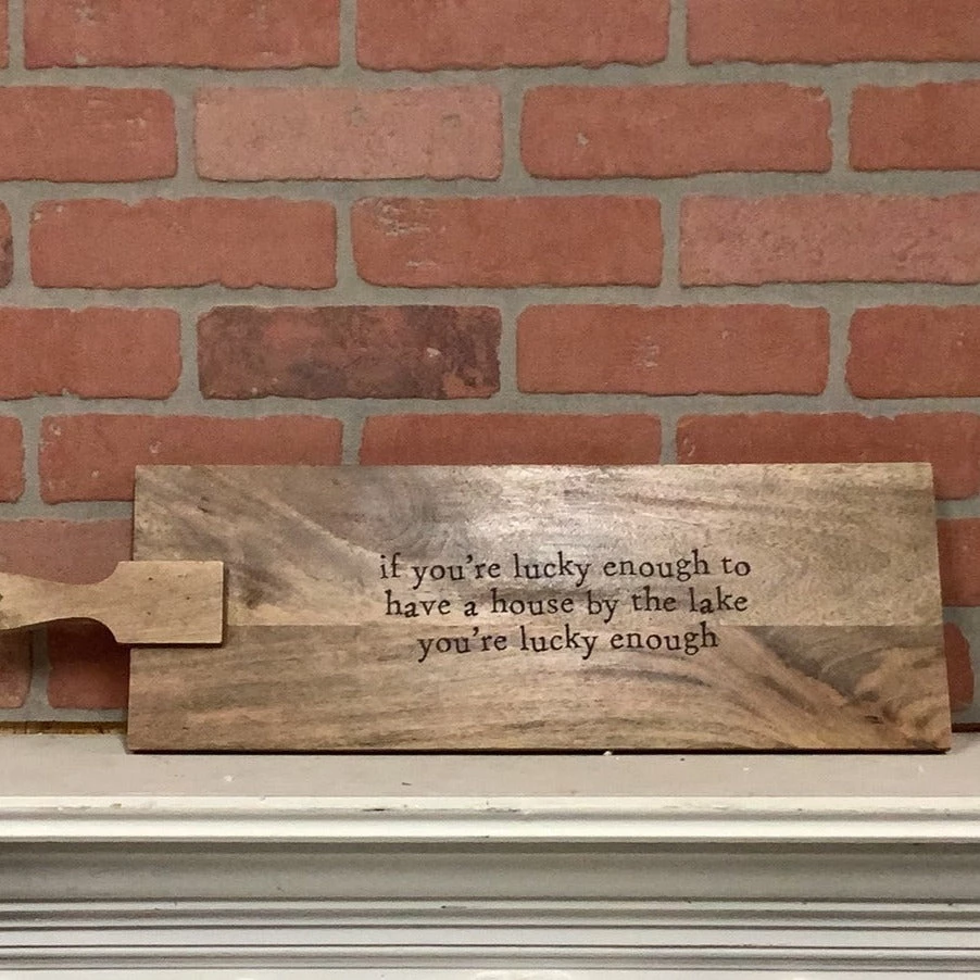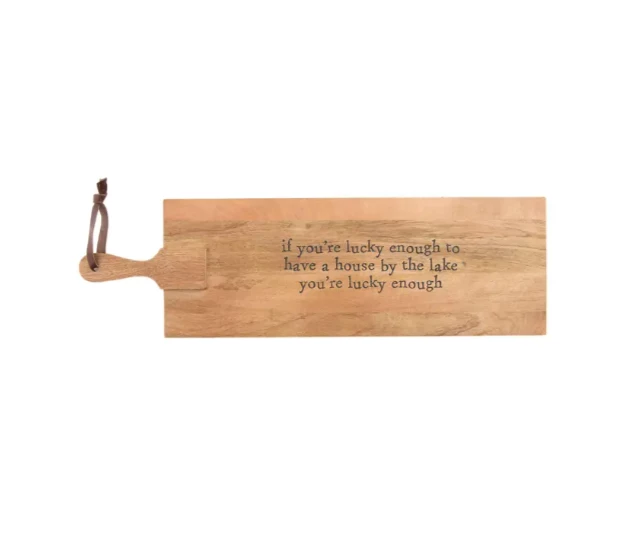 Showcase why you’re lucky at the lake with our Lake Paddle Serving board. The paddle board is made of mango wood and features a hanger on the end of the board. The board features the sentiment “if you’re lucky enough to have a house by the lake, you’re lucky enough”