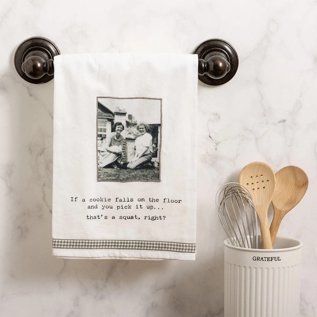 A cotton kitchen towel features a stitched art panel featuring a vintage photograph, “If A Cookie Falls On The Floor And You Pick It Up…That’s A Squat, Right?” sentiment, and gingham ribbon trim. Our Cookie Falls kitchen towel is machine-washable.