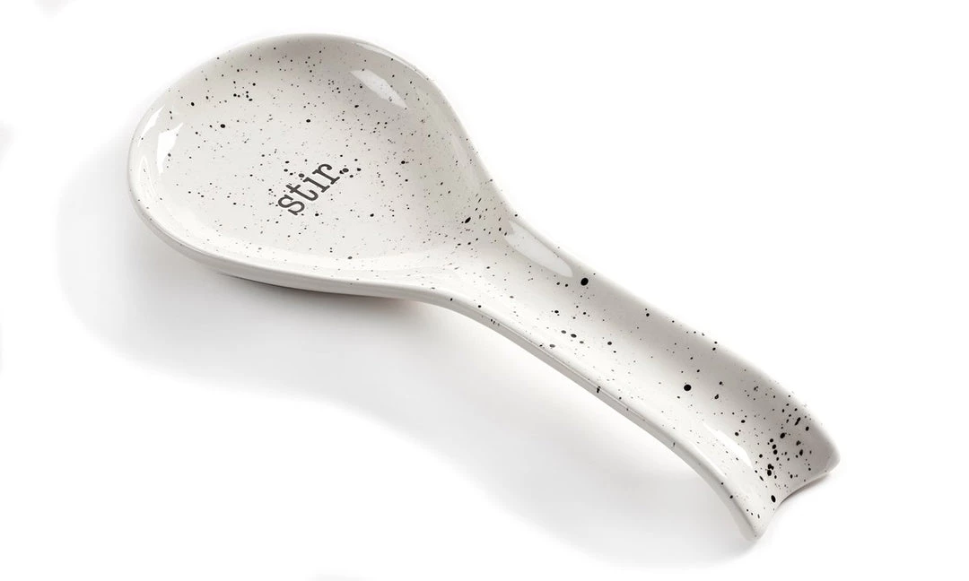 Keep your counter clean with this white ceramic with all-over black specs spoon rest with a STIR sentiment in black typography. FDA approved. Ceramic.