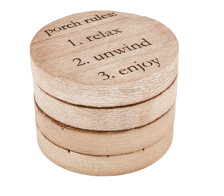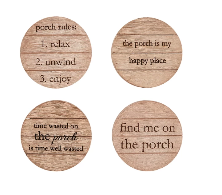 Establish your porch rules with this wood porch coaster set. This set comes with FOUR burnished sentiment planked mango wood coasters. The other coasters read “porch rules: 1. relax, 2. unwind, 3. enjoy”, “the porch is my happy place”, “time wasted on the porch is time well wasted”, and “find me on the porch”.
