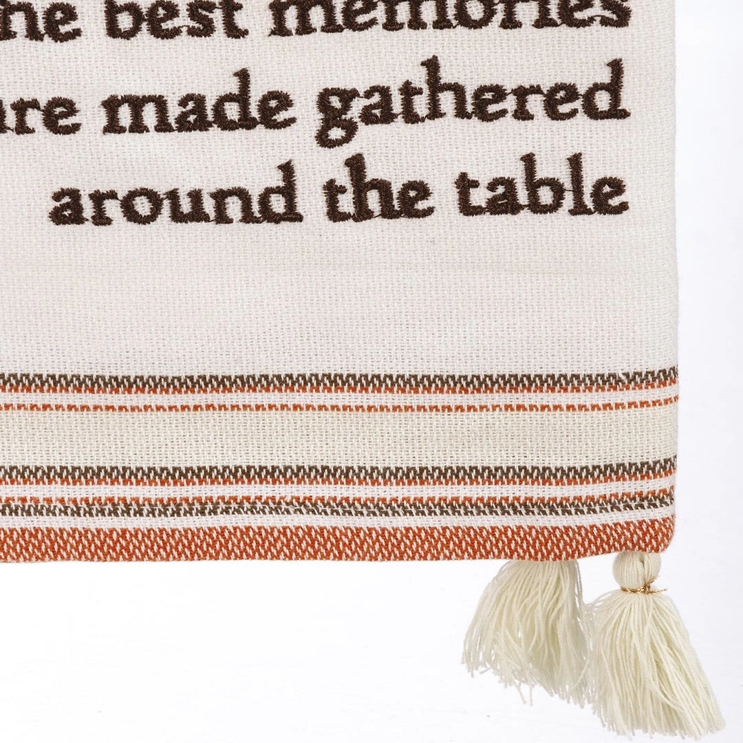A cotton kitchen towel that features a fall-inspired color palette with embroidered “The Best Memories Are Made Gathered Around The Table” sentiment and woven stripe designs. Includes tassel accents for added interest. The kitchen towel is machine-washable.