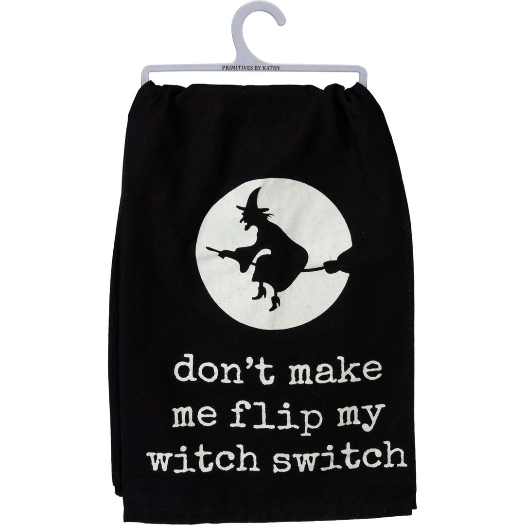 A cotton kitchen towel featuring a “Don’t Make Me Flip My Witch Switch” sentiment, and witch and broom design. Machine-washable.