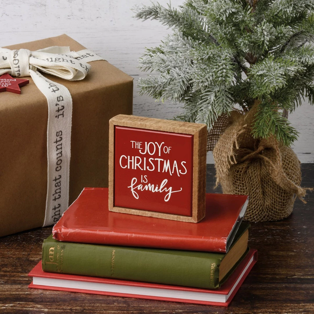 A wooden box sign mini featuring a hand lettered “The Joy Of Christmas Is Family” sentiment and red tile-like faux enamel finish. Our The Joy Of Christmas Is Family box sign mini is easy to hang or can free-stand alone.
