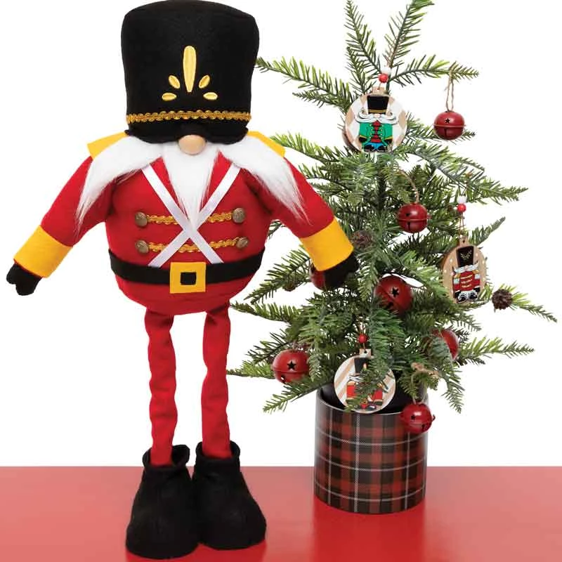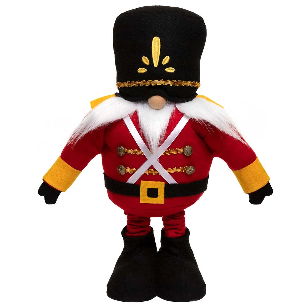 NUTCRACKER GNOME RED WITH GOLD EMBROIDERY ON BLACK HAT, WOOD NOSE, WHITE MUSTACHE/BEARD, BELT, BUTTONS, ARMS AND TELESCOPING/EXPANDABLE LEGS