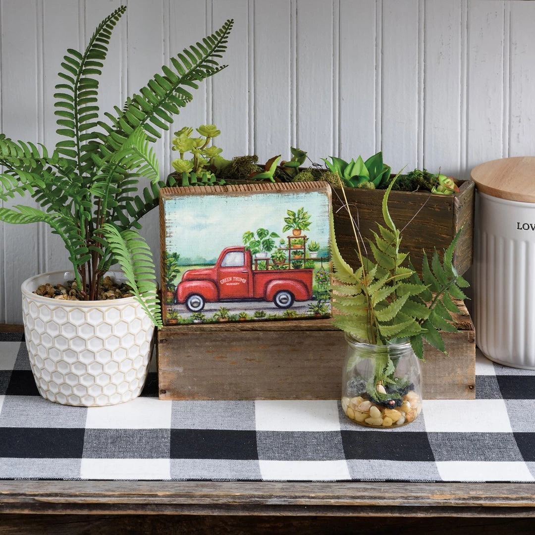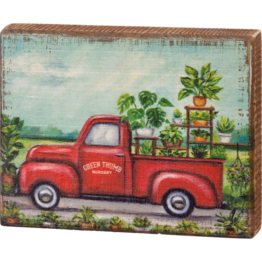 A wooden block sign featuring a whimsical design of a truck hauling a variety of potted plants. Design is replicated from original artwork painted onto burlap canvas, giving the art a unique depth and texture. Easy to hang via predrilled keyhole slot or can free-stand alone!!