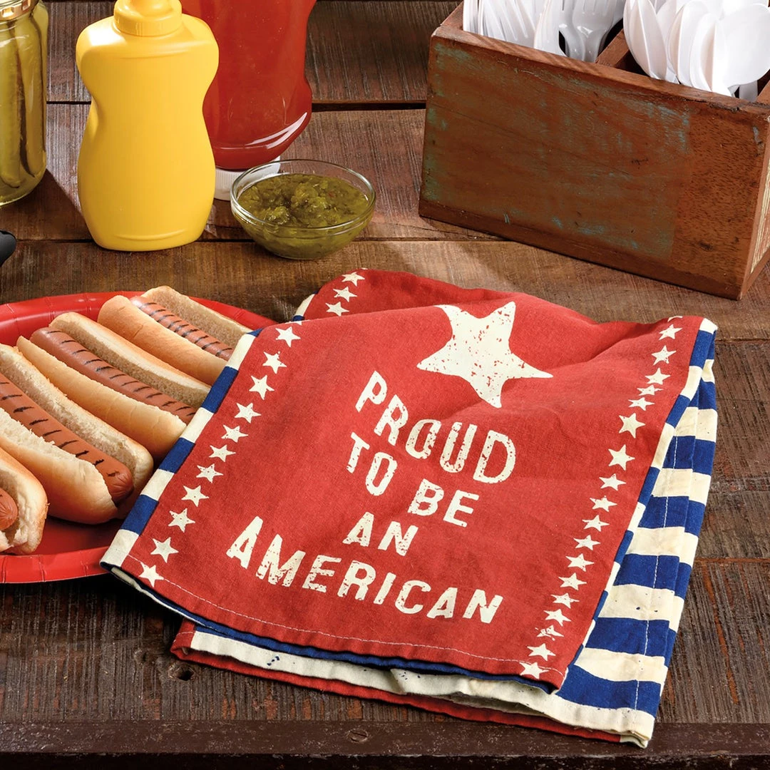 A cotton kitchen towel featuring stars and stripes design and a patriotic palette with a “Proud To Be An American” sentiment. Machine-washable.
