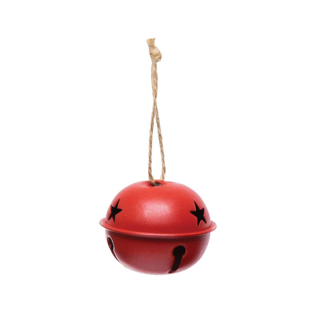 Metal red jingle bell with star cutouts an twine hanger. Set of 3.