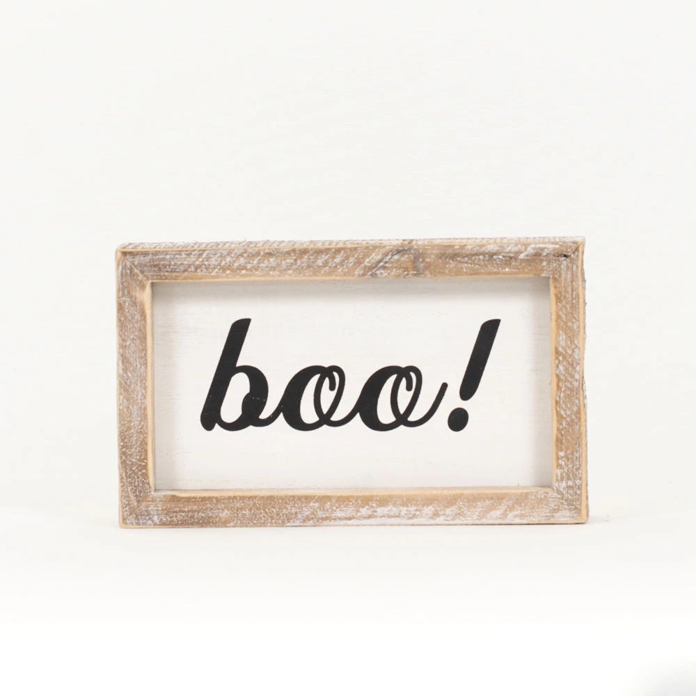 There’s no trick for this treat! It is just a reversible wood-framed sign for your Halloween and Fall. One frame reads, “boo!” while the other reads, “fall!“. It measures 8″ x 4″ x 1.5” and it comes in white, gray, and black colors to invite ghosts of a chance and reap the harvest.