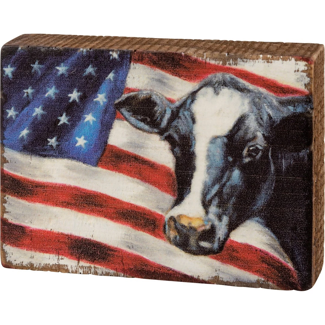 A wooden block sign depicting a cow with an American flag as a backdrop. Design is replicated from original artwork painted onto burlap canvas, giving the art a unique depth and texture. Easy to hang via predrilled keyhole slot or can free-stand alone.