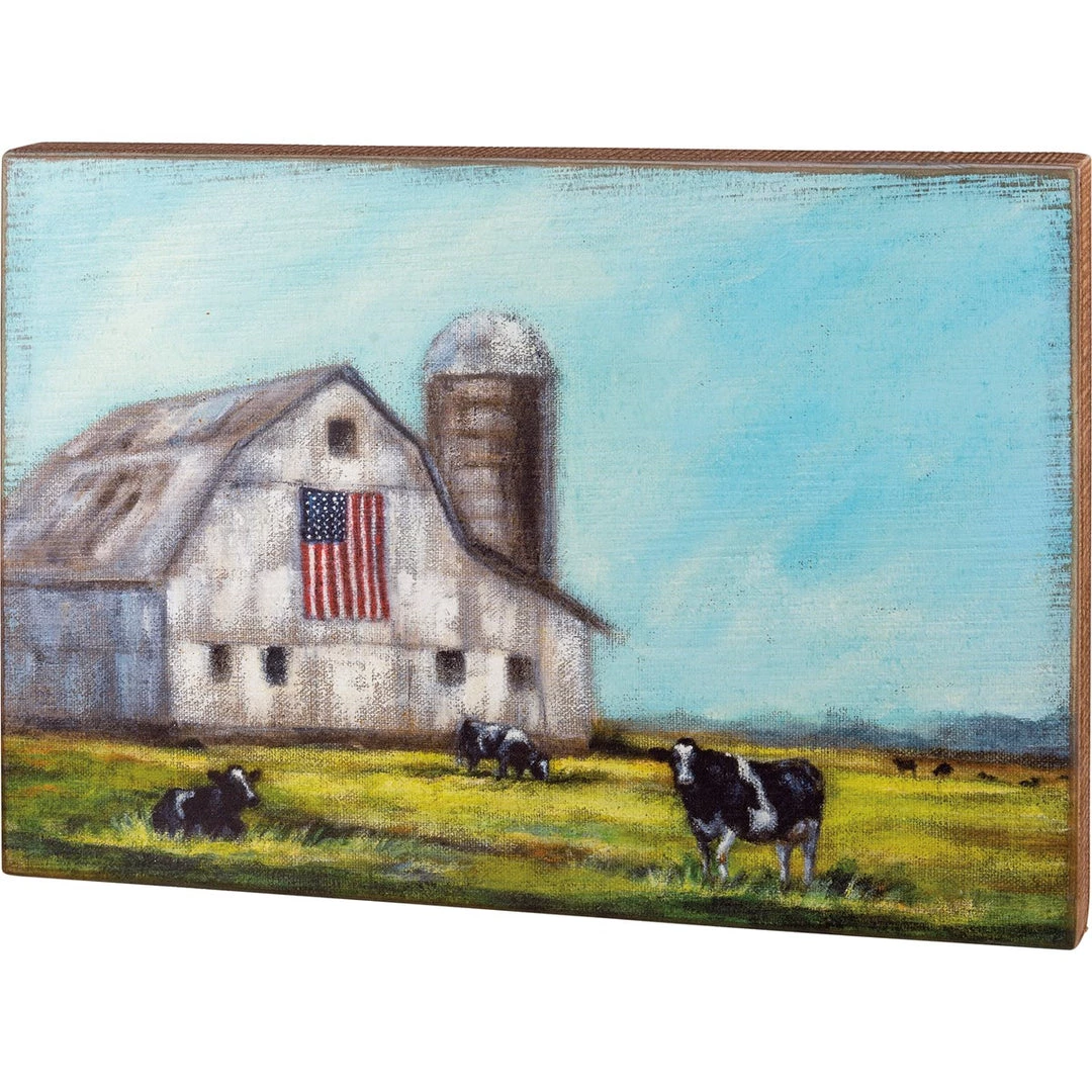 A wooden block sign depicting cows in a field in front of a barn with an American flag. Design is replicated from original artwork painted onto burlap canvas, giving the art a unique depth and texture. Easy to hang via predrilled keyhole slot or can free-stand alone.