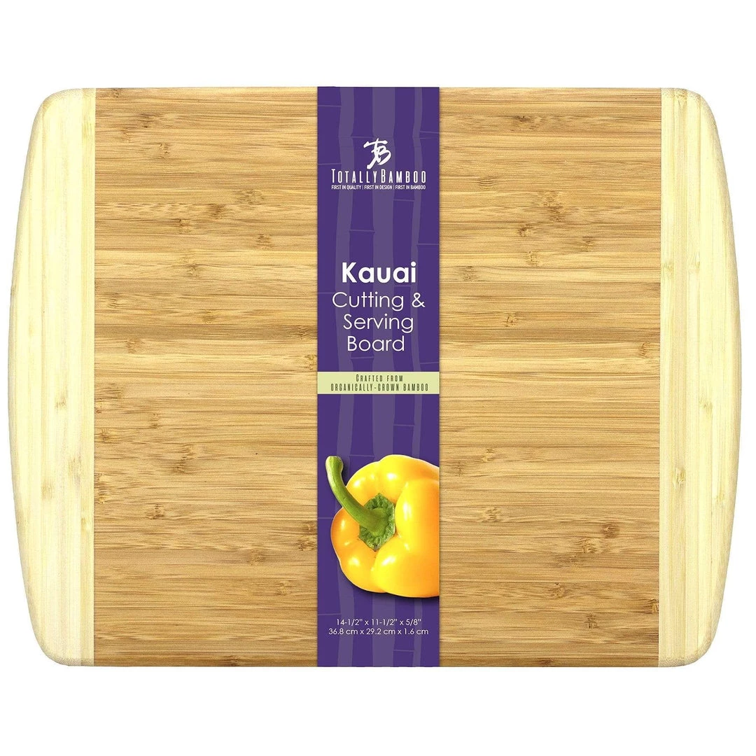 One of the original bamboo cutting boards, the Totally Bamboo Kauai Serving & Cutting Board is the perfect addition to any kitchen. Beautifully crafted from organically-grown Moso bamboo, the board features caps of natural light bamboo flanking the main cutting surface of rich caramelized bamboo. Bamboo is an excellent cutting surface: it’s lightweight yet durable and gentle on knives. The Kauai Bamboo Cutting Board is perfectly sized for everyday use at 14-1/2 inches long and 11-1/2 inches wide. It provides plenty of space for food prep and serving while still being easy to store. When the food prep is done, the Kauai Cutting Board cleans easily with hand washing; do not soak or wash in the dishwasher.