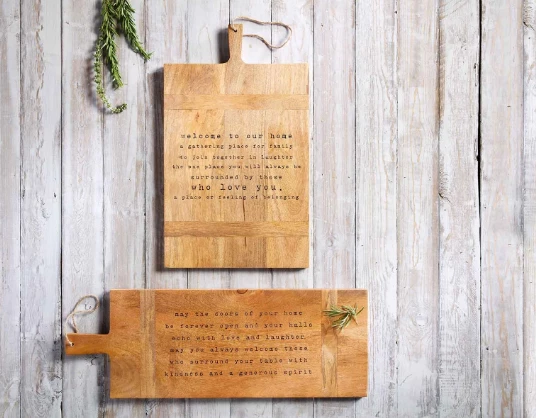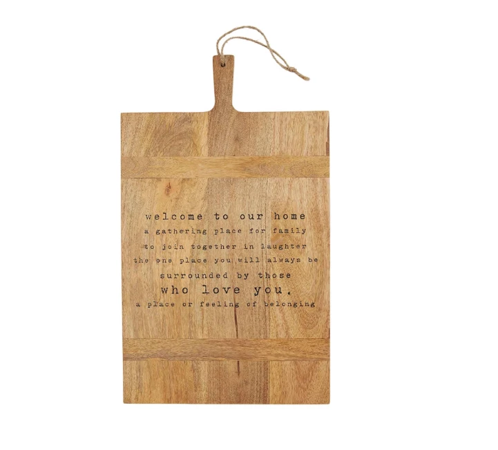 Make our Welcome to Our Home Paddle Board as a gathering place for family. The generous mango wood paddle board features a printed sentiment. The sentiment reads “welcome to our home a gathering place for family to join together in laughter the one place you will always be surrounded by those who love you. a place or feeling of belonging”.