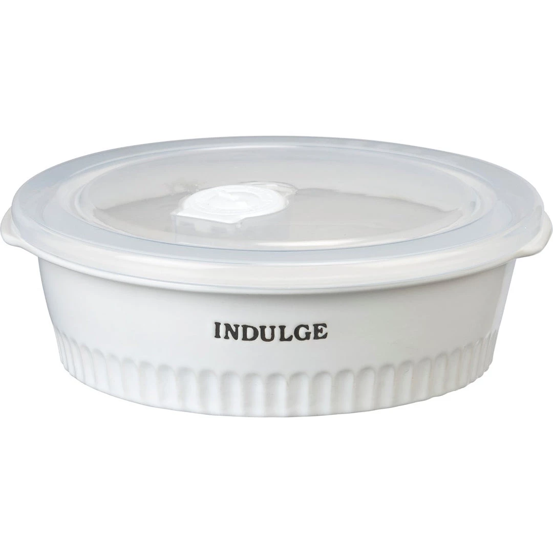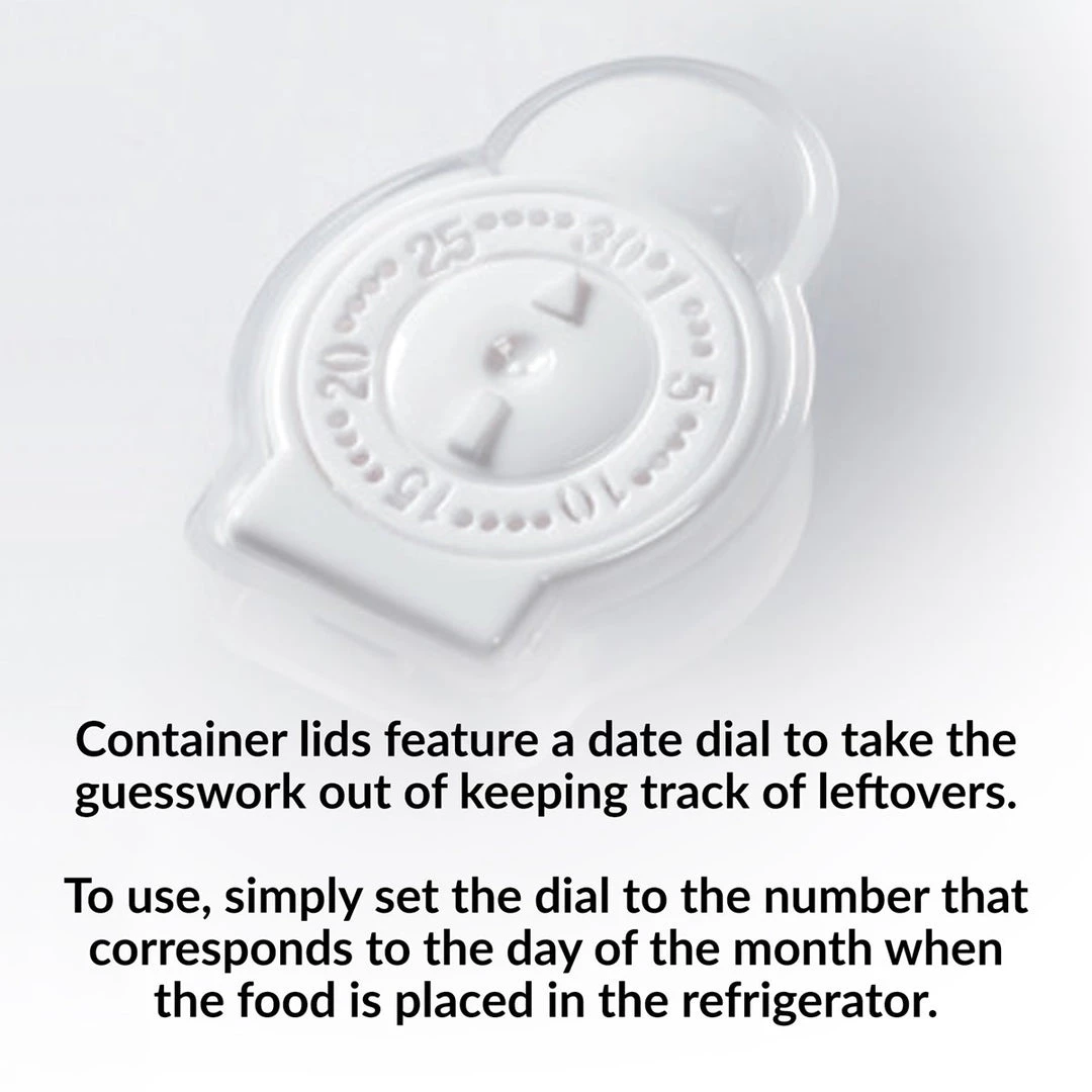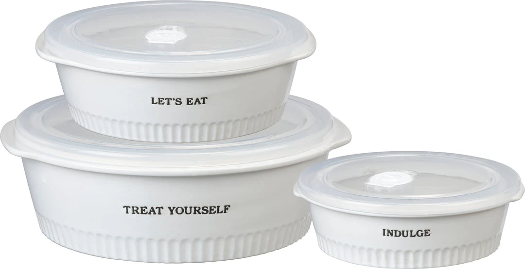 Round nesting stoneware serving dishes. White dishes display sentiments in slate gray across front center of each piece. Features added textural detail around base, and solid rounded handles for easy carrying. Each dish comes with a plastic lid with a rubber seal. Each lid features a date dial to take the guesswork out of keeping track of leftovers. To use, simply set the dial to the number that corresponds to the day of the month when the food is placed in the refrigerator. Microwave, oven, dishwasher and food safe. These dishes make a perfect addition to a farmhouse aesthetic and coordinates well with other pieces in collection!