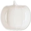 A set of three white pumpkin-shaped stoneware plates in various sizes. Microwave, oven, dishwasher, and food safe.