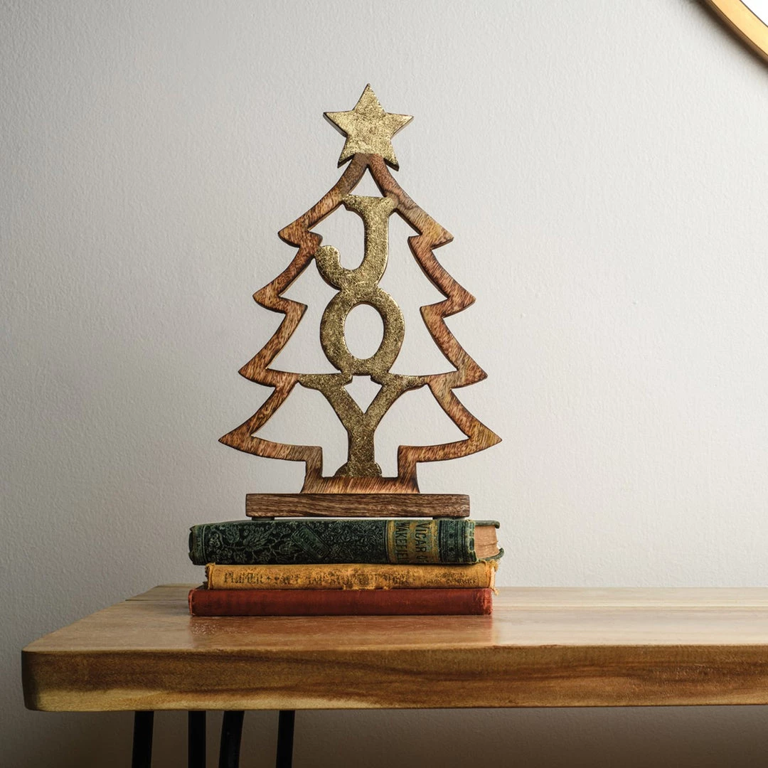 A bohemian style wooden sitter displaying cutout of a Christmas tree outline and “Joy” sentiment on wood base. The Joy tree sitter features natural wood with gold leaf accents on sentiment for added interest!!!