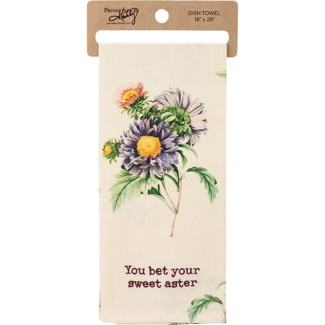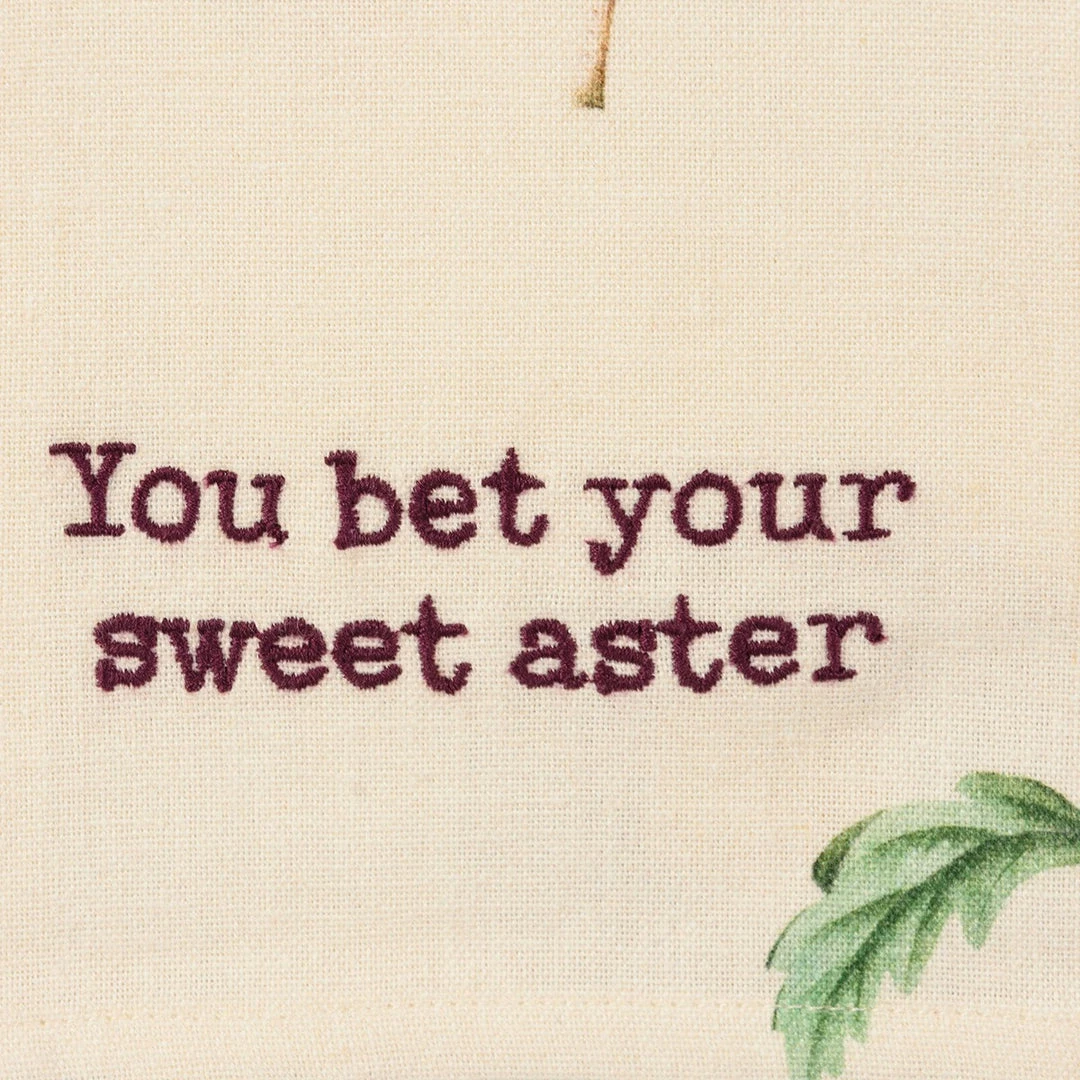 A cotton linen blend kitchen towel featuring an all-over vintage style aster designs and punny embroidered “You Bet Your Sweet Aster” sentiment. Features a cotton tape loop in the corner for easy hanging. Our You Bet Your Sweet Aster kitchen towel is machine-washable!!